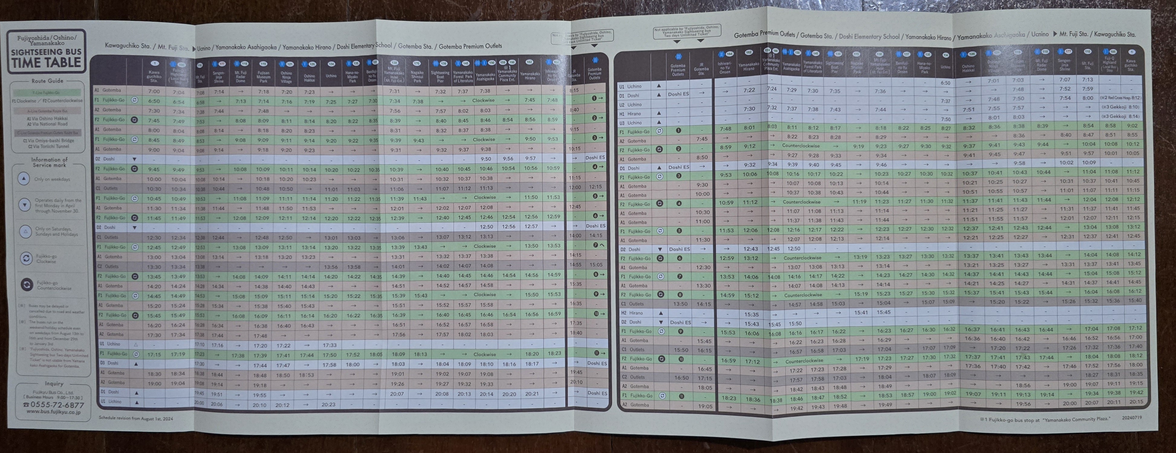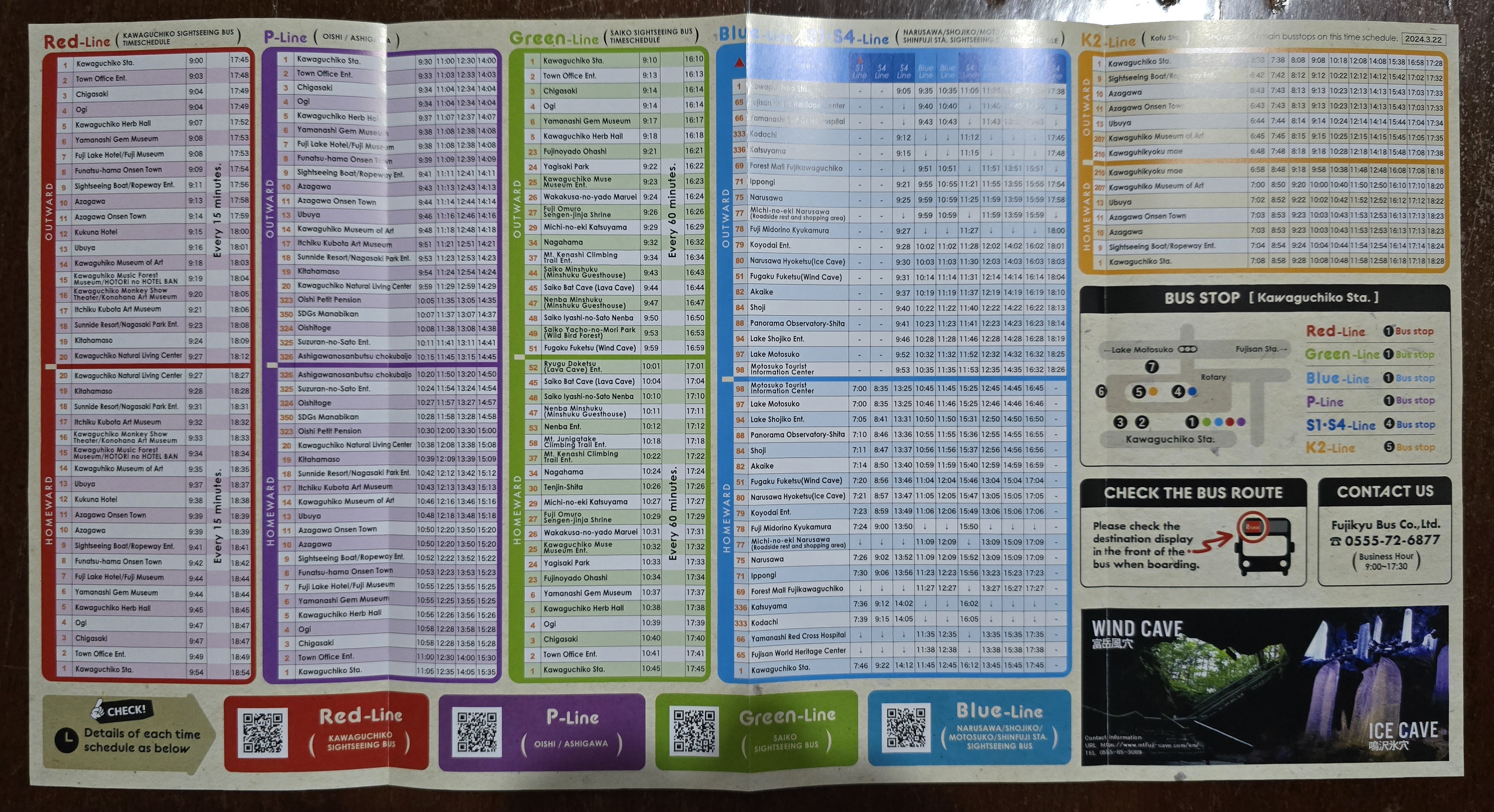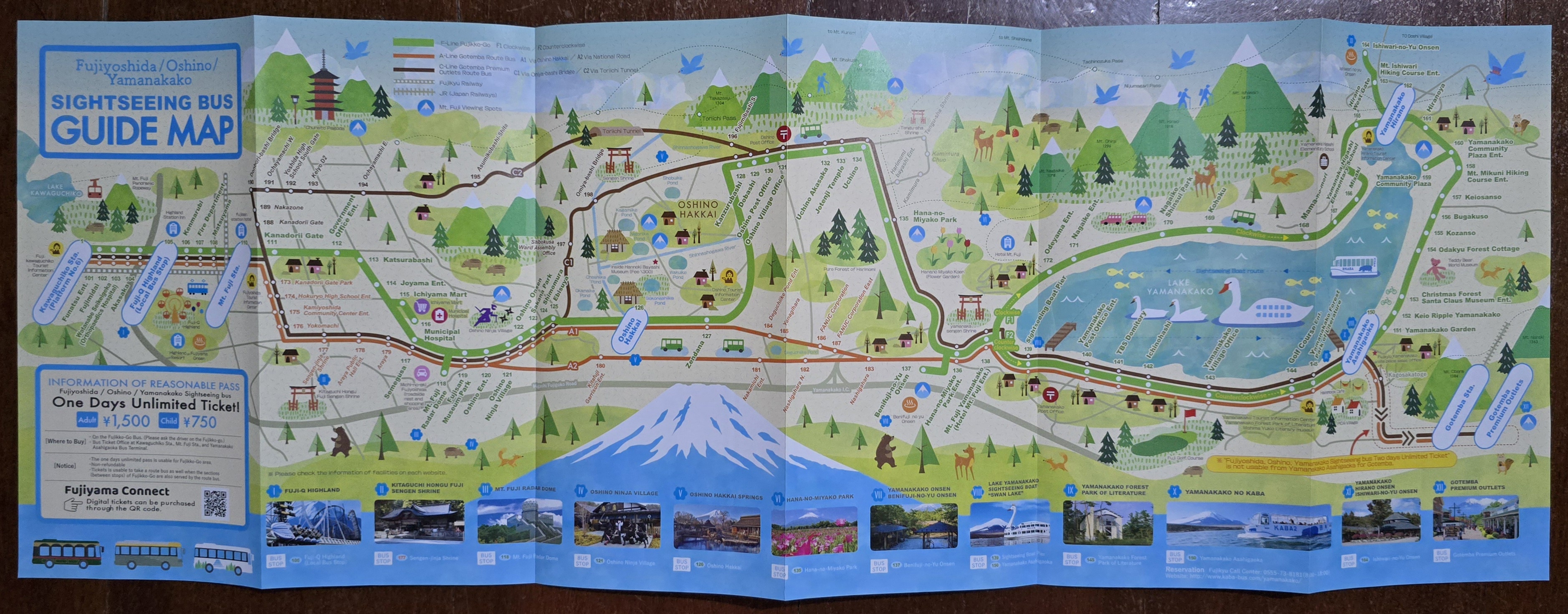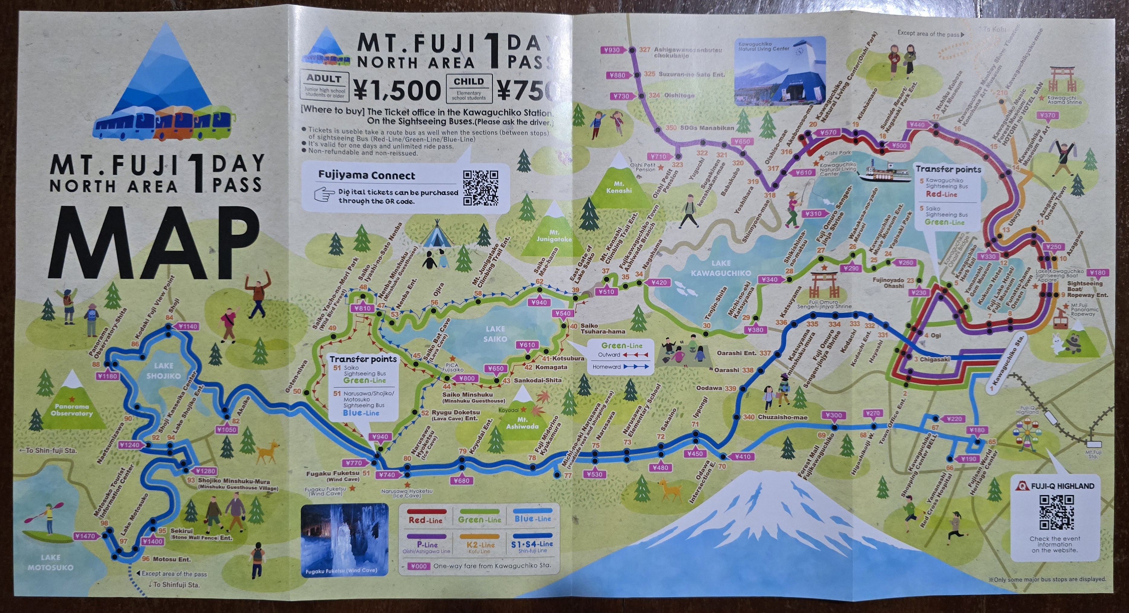 เราเริ่มต้นที่สถานี Kawaguchiko ซึ่งเป็นแหล่งรวมทั้งรถไฟ และ Bus ไปยังจุดต่าง ๆ ขอแนะนำว่าควรใช้บริการ Bus ของที่นี่และควรซื้อบัตร Pass ต่าง ๆ เพื่อประหยัดค่าเดินทาง และที่สำคัญควรมีแผนที่ติดตัวไว้ด้วย เพราะบอกสถานที่ท่องเที่ยว สายสีรถ Bus (สีน้ำเงิน ฟ้า เขียว แดง ส้ม ม่วง และน้ำตาล) และตารางเวลาอย่างละเอียดให้ครบจบที่เดียวเลย ที่นี่เรียก Taxi ยากมาก และหลัง 19.00 น. รถ Bus ก็จะไม่ค่อยให้บริการแล้ว Go with Golf เดินเล่นเรื่อยเปื่อยจนรถ Bus หมดเวลาให้บริการแล้วก็มี จำเป็นต้องเดินกลับโรงแรมเองด้วย แต่บรรยากาศการเดินนั้นดีมากจริง ๆ ได้ประสบการณ์ไปอีกแบบ