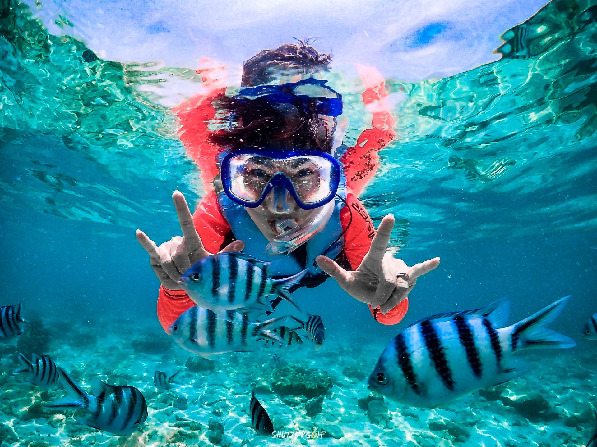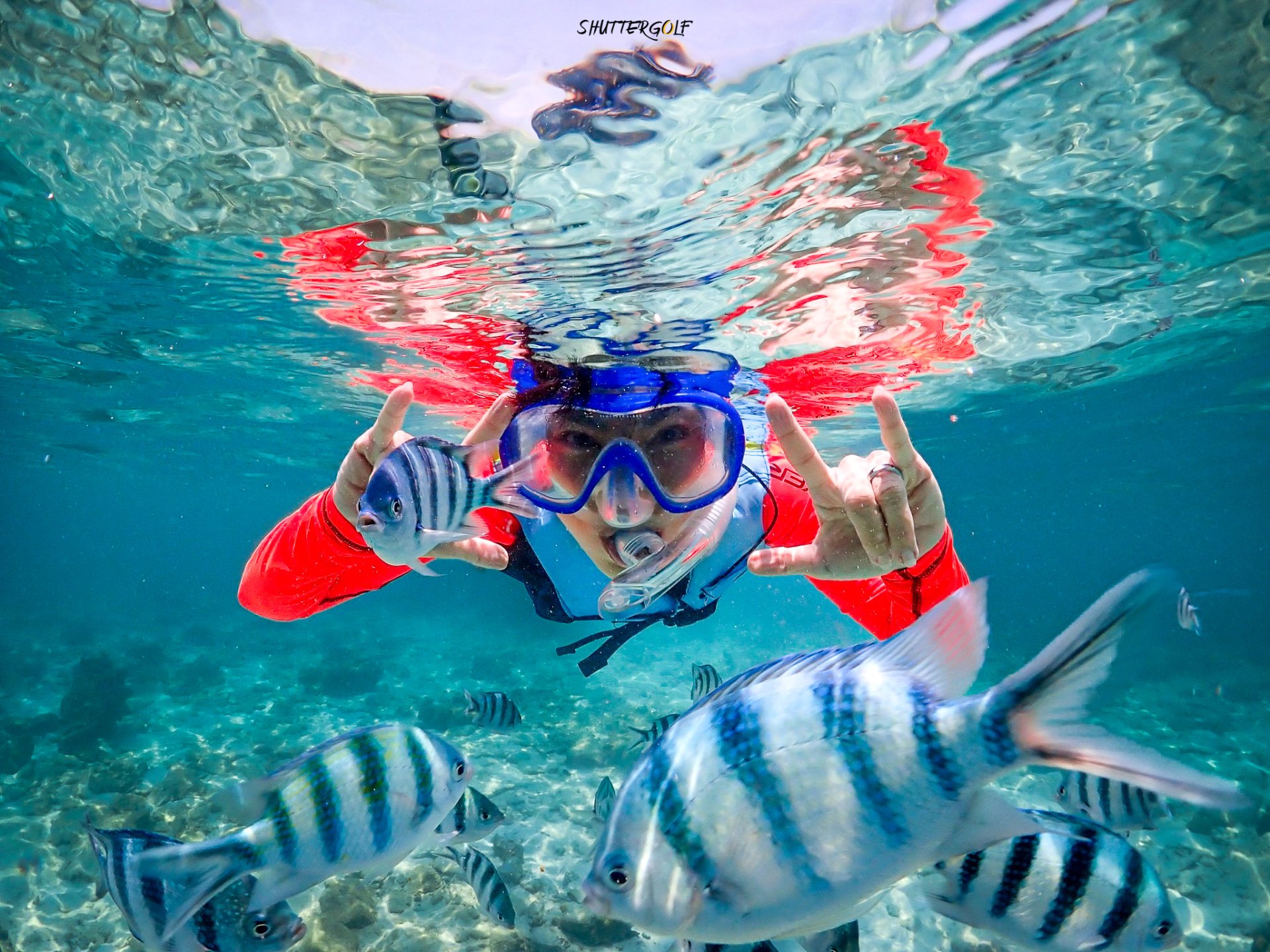 ที่จุดดำน้ำแรกนี้ นักท่องเที่ยวสามารถเห็นปลาได้อย่างง่ายดายและมีจำนวนมาก สำหรับมือใหม่ ไม่ต้องกังวลเพราะทีมงานจะสอนการใช้อุปกรณ์และทรงตัวขณะดำน้ำดูปลา ShutterGolf มีประสบการณ์อยู่แล้วจึงเป็นเรื่องง่าย สิ่งที่ ShutterGolf ต้องจัดการก่อนที่จะสวมใส่อุปกรณ์เพื่อดำน้ำ คือ การทำความสะอาดแว่นตา + Snorkel ด้วยสเปรย์แอลกอฮอลล์ที่เตรียมไปด้วย